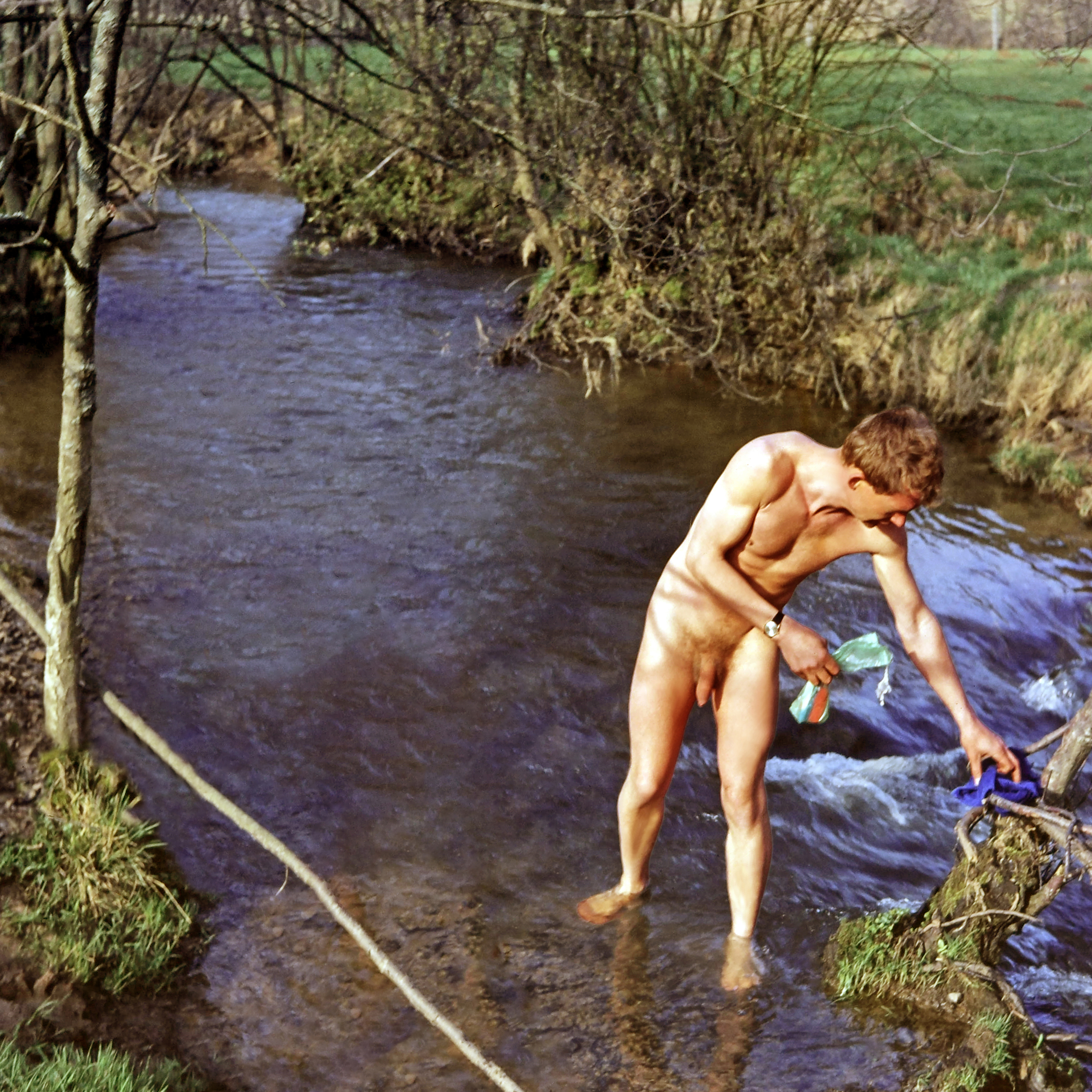 FKK - nackt und frei - Nackter Mann bei der Morgentoilette in einem Bach in der Eifel